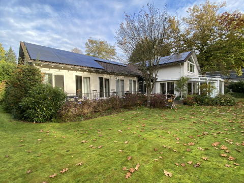 De keuken (18m²) heeft een open verbinding met een study (6m²) en met de tuingerichte woonkamer (21m²), die opvalt door de grote en hoge raampartijen en het hoge plafond. Tussen de woonkamer en de keuken is een ruime bergkast, waar de cv-ketel geplaatst is.